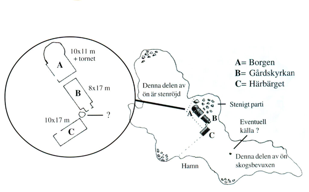 På udden syns idag resterna av tre byggnader. Den största byggnaden, som ligger i öst-västlig riktning, har varit försedd med källare och var gårdens huvudbyggnad. Strax öster om denna syns resterna av den byggnad som till formen motsvarar en kyrka med långhus och smalare kor. Söder om denna återfinns resterna av en tredje byggnad, sannolikt en förrådsbyggnad.