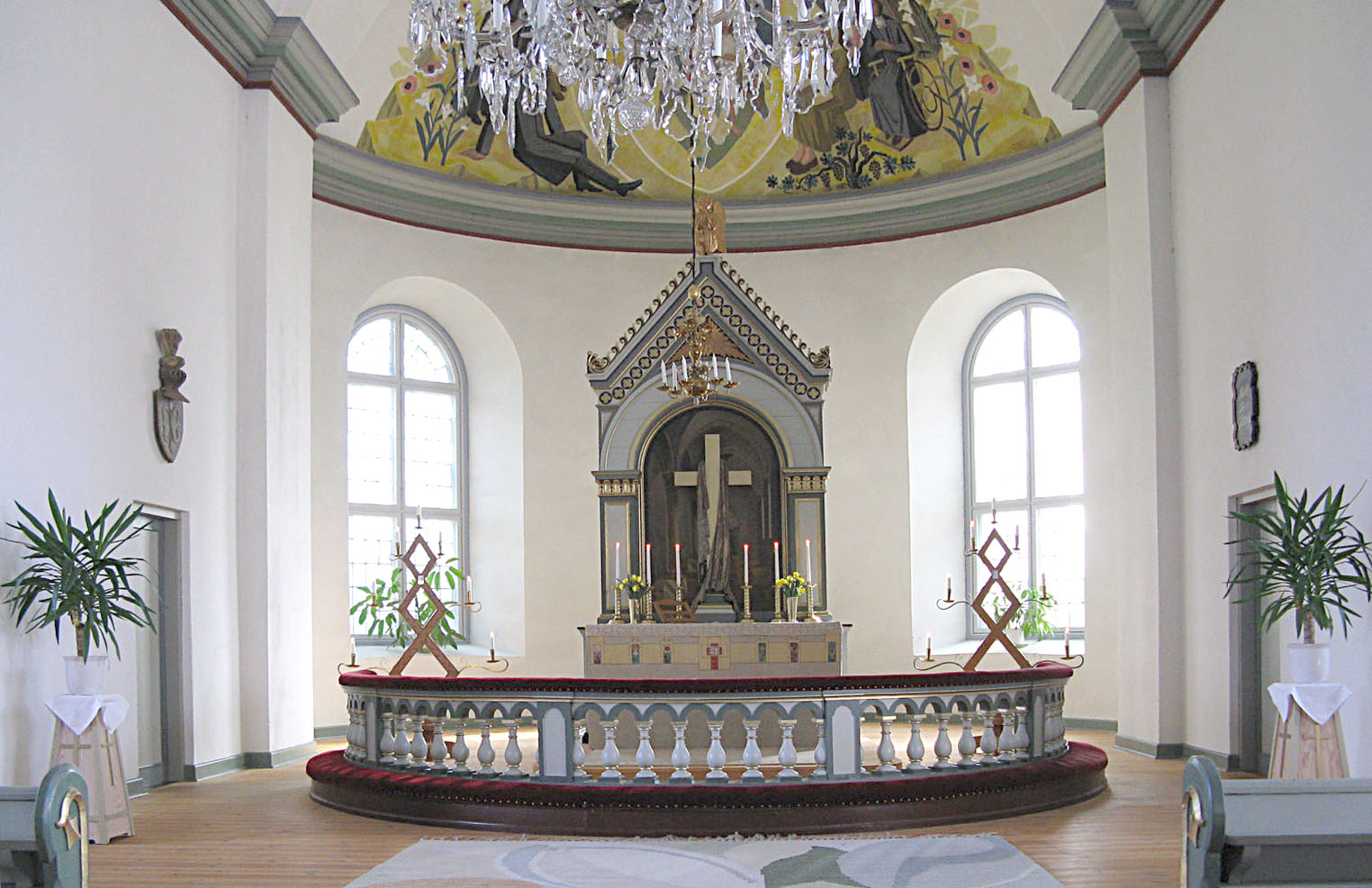 Flera föremål kommer från den gamla 1200-talskyrkan, vars ruin kan ses i backen söder om nuvarande. Korset på altaret, den gamla predikstolen från 1592 vid kyrkans högra sida, samt den trearmade ljusstaken från 1600-talet, kommer från den gamla kyrkan.