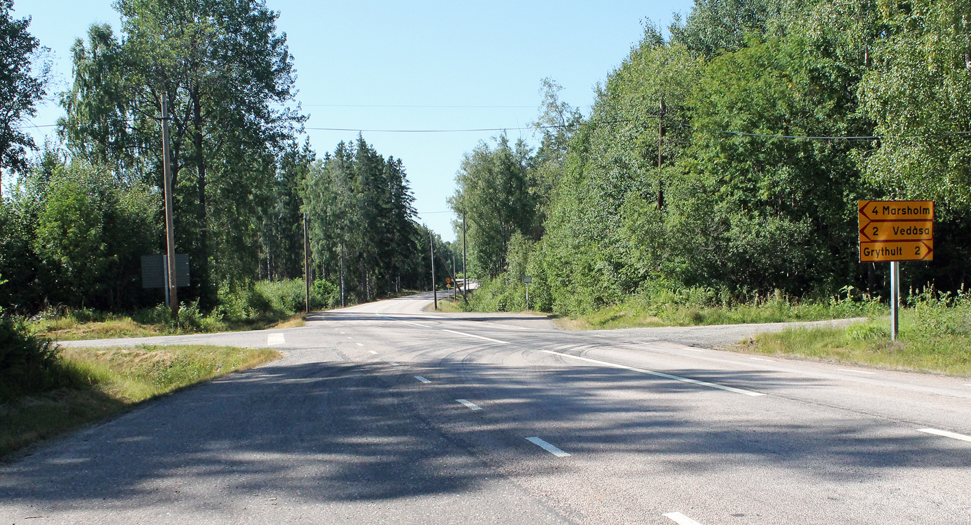Här finns sedan gammalt en korsväg, där vägen till höger leder till Vedåsa by och Marsholms gård, till vänster mot Grythults by. Fortsätter man rakt fram kommer man till Liatorp.