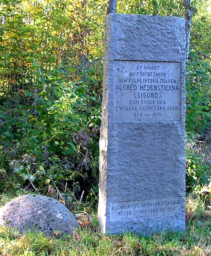 Alfred Hedenstiernas, (Sigurds), minnessten restes av Hembygdsföreningen 1952. Året före, då det var det 100 år sedan författaren och folklivsskildraren Alfred Hedenstierna (Sigurd) föddes, beslöt styrelsen att inköpa en minnessten, att resas i Vedåsa Östergårds ägor, där Sigurd tillbringade sin barn- och ungdomstid, åren 1854-1879.